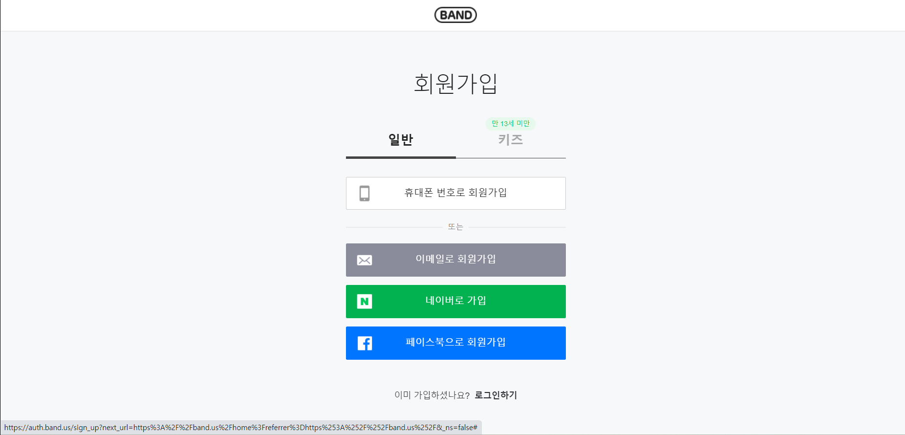 그러나 아직 위의 5가지 방법으로 로그인이 안되시는 분들은 맨 아래에 나와 있는 회원가입을 누르셔서 새로 가입을 하시고 밴드에 로그인하셔도 됩니다. 저는 가장 보편적으로 쓰이는 네이버 로그인을 통해 로그인해 보았습니다.