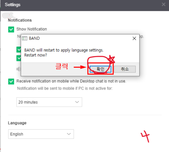 네이버 밴드 pc버전을 다운로드하여서 잘 사용하려고 했는데 갑자기 영어나 알 수 없는 언어가 떠서 당황하신 분 있으신가요? 걱정 마시고 아래의 방법으로 언어 설정을 변경해 보세요. 모르는 언어가 나오더라도 절대 당황하지 마시고 차근차근 따라 해 보세요. 그리고 마지막에 확인을 누르시면 네이버밴드 pc버전이 새롭게 시작된다는 뜻이니 꼭 눌러주세요.