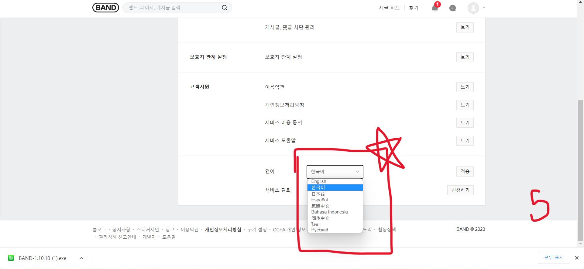 1. 다운로드를 완료한 뒤에 브라우저 아랫부분에 있는 band-1.10.10.exe 버튼을 클릭해서 설치 파일을 실행한다.